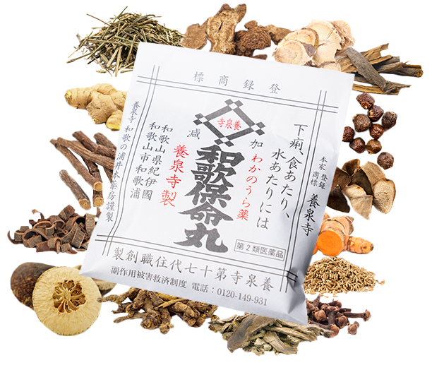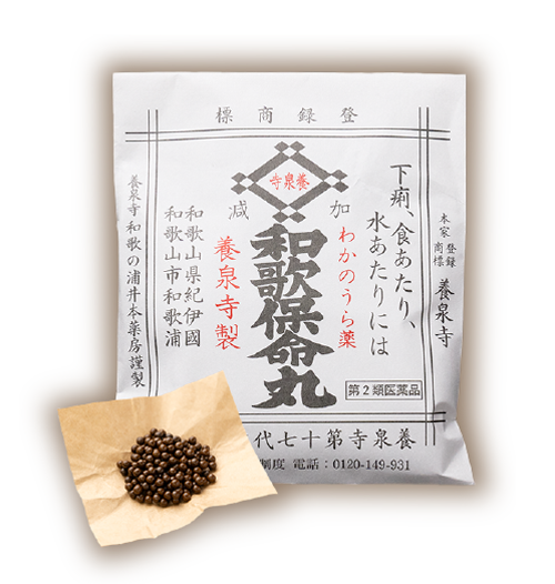 創業四百年の胃腸薬 戦国時代に教如上人より伝えられた「紀州のはらぐすり」15種類の生薬末を配合 和歌保命丸今すぐ購入 第二類医薬品 わかのうら薬 和歌保命丸 (胃腸薬) 【効能・効果】 下痢、消化不良による下痢、軟便、食あたり、吐き下し、水あたり 第二類医薬品 わかのうら薬 和歌保命丸 【内容量】 1袋3包入り 1包90丸 合計10袋(30回分) 【用法・用量】 一日3回食後に水又は白湯にて服用 15歳以上:1回90丸 11歳以上15歳未満:1回60丸 8歳以上11歳未満:1回45丸 5歳以上 8歳未満:1回30丸 15種類の生薬末配合 黄連 (オウレン) 熱を冷まし、解毒し、下痢・イライラを改善する。 苦参 (クジン) 腸内改善に優れている。 枳実 (キジツ) 消化不良や便秘、お腹の張りを解消する。 甘草 (カンゾウ) 熱を冷まし、解毒し、処方全体のバランスを整える役割がある。 莪述 (ガジュツ) 血液の流れを促し、痛みを和らげる。 陳皮 (チンピ) 消化を助け、お腹の張りを和らげる。 木香 (モッコウ) 腹痛や膨満感を軽減する。 厚朴 (コウボク) お腹の張りを和らげる。 桂皮 (ケイヒ) 胃を温め、寒さによる痛みを和らげる。 縮砂 (シュクシャ) 胃を温め、寒気を取り、吐気を抑える。 丁子 (チョウジ) 胃を温め、逆流を抑え、冷えによる吐き気や腹痛を改善する。 生姜 (ショウキョウ) 胃を温め、寒気を取り除き、吐気を抑え、腹痛を改善する。 茴香 (ウイキョウ) 寒冷による腹痛に有効。 白朮 (ビャクジュツ) 胃腸の運動機能を強化する。 当薬 (センブリ) 胃腸の消化機能を高める効果がある。 和歌保命丸今すぐ購入 × 次の質問事項にお答えください 1. 和歌保命丸を服用したことがありますか。 ある ない 2. 和歌保命丸でアレルギーを起こしたことがありますか。 ない ある(購入不可) 3. 授乳中の方は、本剤を服用しないか、服用する場合は授乳を避けてください。 はい 該当しない 4. 本剤を服用している間は、他の下痢止め薬を服用しないでください。 はい 5. 服用の際は、添付文書をよく読み理解した上で服用してください。 はい 四百年の伝承:和歌保命丸の由来 和歌保命丸は日本戦国時代末期の天正年間(およそ西暦1580年代)に誕生し、現在に至るまで約440年の歴史があります。伝えによれば、石山合戦の後、浄土真宗の高僧・教如上人が紀州・和歌浦に避難した際、地元の井本家の先祖である井本源兵衛が命懸けで救出したとされています。教如上人はその恩に報いるため、腹痛や胃腸の不調を和らげる「はらぐすり」の処方を井本家に託し、地域の人々を救う手だてとするよう、伝えられたといわれています。その後、井本家は代々養泉寺の薬房にて、その「はらぐすり」を製造し続けています。戦国時代から現代に至るまで、和歌保命丸は家庭の常備薬として人々の胃腸の健康を守り続け、和歌山に来られた方がおみやげとして「みかん・梅干し・わかのうら(和歌保命丸の通称)」を買って帰る、地域文化の象徴ともなっています。 和歌保命丸今すぐ購入 よくある質問 和歌保命丸は何に効くのですか? 主に下痢、食あたり、水あたり、吐き下しなどの症状に用いられます。 和歌保命丸はなぜ効くのですか? 和歌保命丸には、15種類の生薬を粉末状で配合しています。それぞれの生薬が持つ効能が重なり合い、相乗的に働くことで、優れた効果を発揮すると考えられています。核心的な作用原理は、体内の湿熱を取り除き、気の流れを整え、脾胃(消化器系)を温めて養うことにあります。これにより、体本来の働きが整い、自己調整力が回復します。また、甘草は気を補い、全体のバランスを整える役割を持ち、薬効を高めつつ、体力の消耗も防ぎます。 妊婦が服用しても問題ありませんか? 妊娠中の方は、服用をお控えください。 子どもが服用しても問題ありませんか? 5歳未満の乳幼児への服用はお避けください。5歳以上のお子様は、以下の用量・用法を厳守して服用してください5歳以上〜8歳未満:30丸8歳以上〜11歳未満:45丸11歳以上〜15歳未満:60丸15歳以上:90丸 いつ服用するのがよいですか? 食後の服用 一回の服用量はどのくらいですか? 1回90粒が目安です。 どこで購入できますか? 本サイトにてご購入いただけます。購入ボタンはページ内の複数箇所にございますので、お好きな場所からご利用ください。 株式会社和歌の浦井本薬房 Wakanoura Imoto yakubou Co.,Ltd. プライバシーポリシー 特定商取引法に基づく表示 医薬品販売にあたっての表示義務の記載 利用規約 〒641-0025和歌山県和歌山市和歌浦中2丁目7番16号TEL:073-444-0226FAX:073-447-1791受付時間:10:00~16:00(土・日・祝日を除く)※日本語のみの対応となります。 Copyright © 2025 株式会社和歌の浦井本薬房. All Rights Reserved.